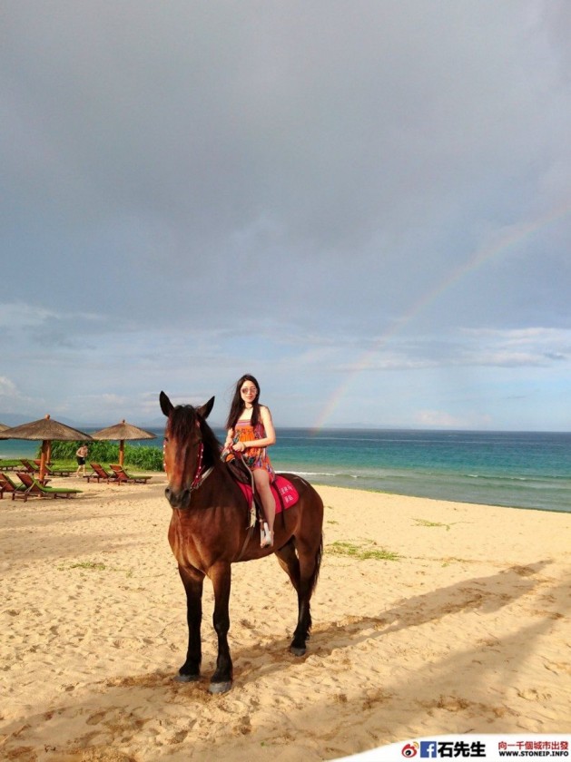酒店提供直升機服務,可接送至附近蜈支洲島景點。另有騎馬體驗,使用酒店飼養的兩匹馬匹,包括一匹白馬。馬匹置於專設馬房,由專人照顧,體態較健壯。騎馬路線位於沙灘,受天氣影響,如遇彩虹可見特別景色。三亞天氣多變,常有陣雨。白馬體型較小。