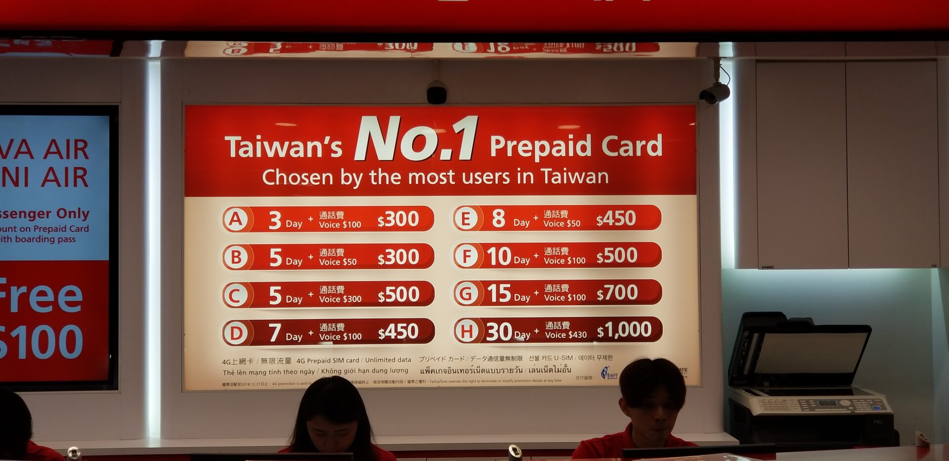 機場櫃位專為旅客開放,市區無此價格優惠。中華電信櫃位開放至晚上10時,遠傳至晚上12時,台灣大哥大至晚上11時。早晨約8時至9時開始營業。人龍長短不一,可選擇較短隊伍。
