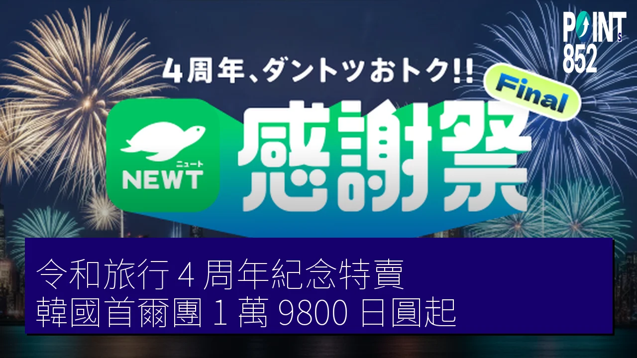 令和旅行(令和トラベル,總裁篠塚孝哉,位於東京都澀谷區)正進行服務啟動4周年紀念促銷,名為「超值、遙遙領先!! 4周年NEWT感謝祭Final」。該促銷自2026年4月16日起,至5月9日(星期六)結束。公司提供多項旅行產品,包括前往韓國首爾(ソウル)的團體行程,每人起價¥19,800 / 約 HK$1,030,以及夏威夷旅行產品,每人起價¥98,800 / 約 HK$5,138。上述價格已包含燃油附加費,但不包括諸稅。