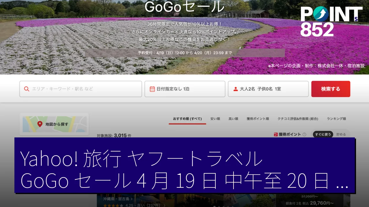 LINE Yahoo!(LINEヤフー)旗下旅行預訂網站 Yahoo! 旅行(Yahoo!トラベル / ヤフートラベル),於 4 月 19 日中午 12 時起至 20 日結束,舉辦名為 GoGo 特賣會(GoGoセール)的限時促銷活動。