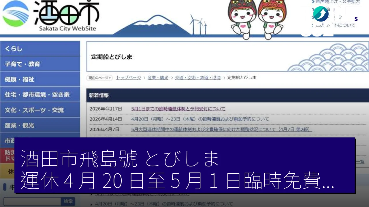 飛島號(とびしま)運休期間為4月20日至5月1日,酒田市定期航路事業所使用小型遊漁船及國土交通省酒田港灣事務所的「瑞穗」(みずほ)艇提供臨時運航,直至替代船隻手配完成。每日班次視海況調整,優先島民登船。