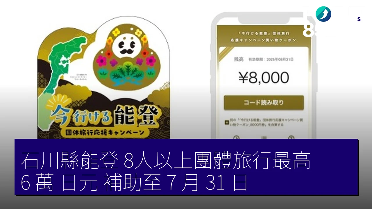 石川縣能登 8人以上團體旅行最高 6 萬 日元 補助至 7 月 31 日