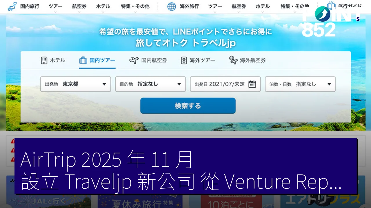 AirTrip(エアトリ)宣布,其完全子公司 Traveljp(トラベルjp)將從連結子公司 Venture Republic(ベンチャーリパブリック)接收旅行資訊網站「Traveljp」的業務。