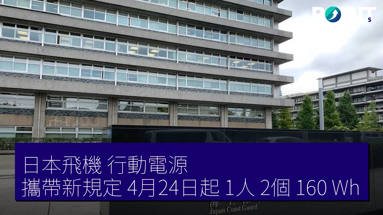 日本國土交通省從 4 月 24 日起適用新規則。機內攜帶限 1 人 2 個(160Wh 以下),禁止機內電源充電至行動電源及行動電源充電至其他電子產品。預備電池 100Wh 以下無個數限制,100Wh 以上至 160Wh 以下與行動電源合計 2 個。