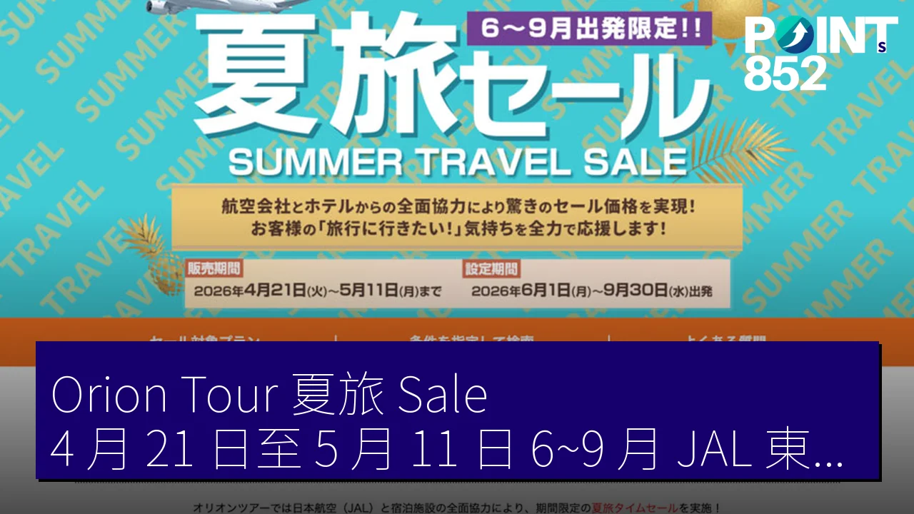 Orion Tour(オリオンツアー)正舉辦「夏旅セール」,時間由 4 月 21 日上午 11 時至 5 月 11 日下午 11 時半。