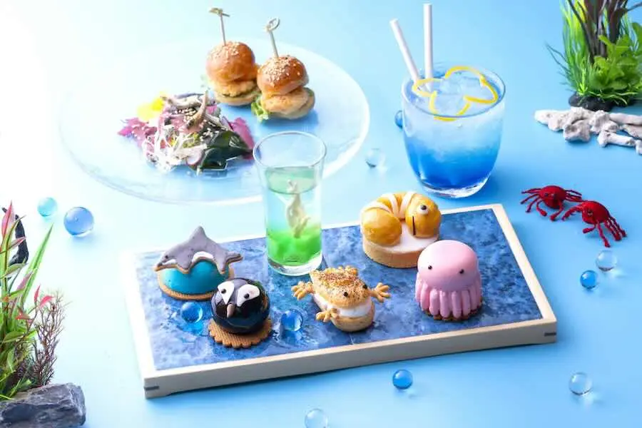 此次下午茶的主題靈感來自水族館內約 250 種、共約 15,000 件的生物,特別設計了六款精緻甜品,包括「大山椒魚奶油泡芙」、「巧克力慕斯企鵝」、「粉紅色水母」、「海豹桃子果凍」、「海豚冰糖餅乾」及「錦鰻芒果奶油塔」。此外,亦提供了迷你布里歐修漢堡夾炸蝦及海藻沙拉等鹹食,並有無限暢飲的飲品選擇。