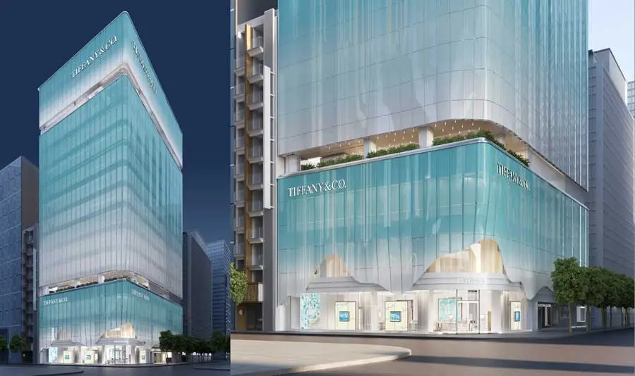 蒂法尼於7月11日正式開幕亞洲最大的旗艦店「蒂法尼 銀座」,該店的設計靈感來自紐約總店,建築師青木淳負責此項目。這座高達66米的建築以蒂法尼藍為主色,配以波浪形狀的玻璃外立面和展示窗,營造出獨特的視覺效果。建築設計汲取自路易斯·康福特·蒂法尼的藤燈,並與藝術家藤村喜美子合作,展現自然主題的當代藝術風格,進一步提升了建築的視覺衝擊力。