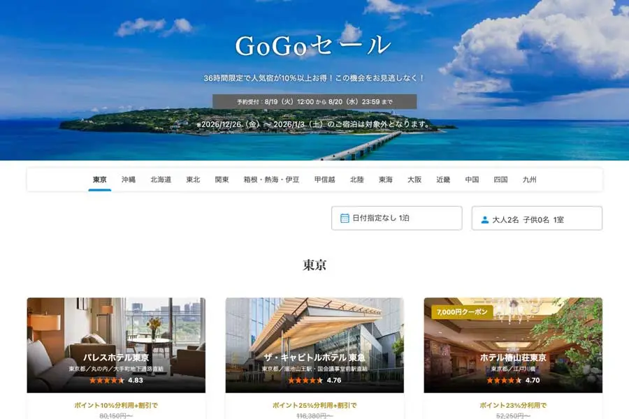 一休近日在其旅行預訂網站「一休.com」上舉行了一項名為「GoGo促銷」的活動,活動時間為8月19日中午12時至8月20日,為期36小時。此活動期間,部分受歡迎的住宿設施將享有超過10%的折扣,但需注意,2023年12月26日至2026年1月3日的年末年始假期不在此促銷範圍內。