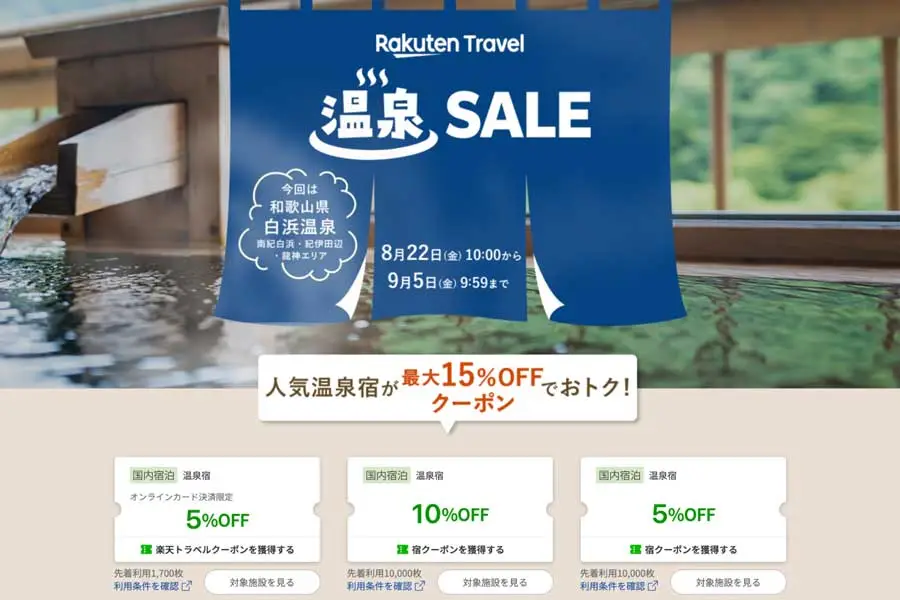 楽天集團宣布,將於8月22日上午10時至9月5日上午9時59分,在旅行預訂網站「楽天旅遊」舉辦「溫泉特賣」。此次活動主要針對和歌山縣的白濱溫泉及周邊南紀白濱、紀伊田邊、龍神地區,消費者可享受最高15%的折扣。