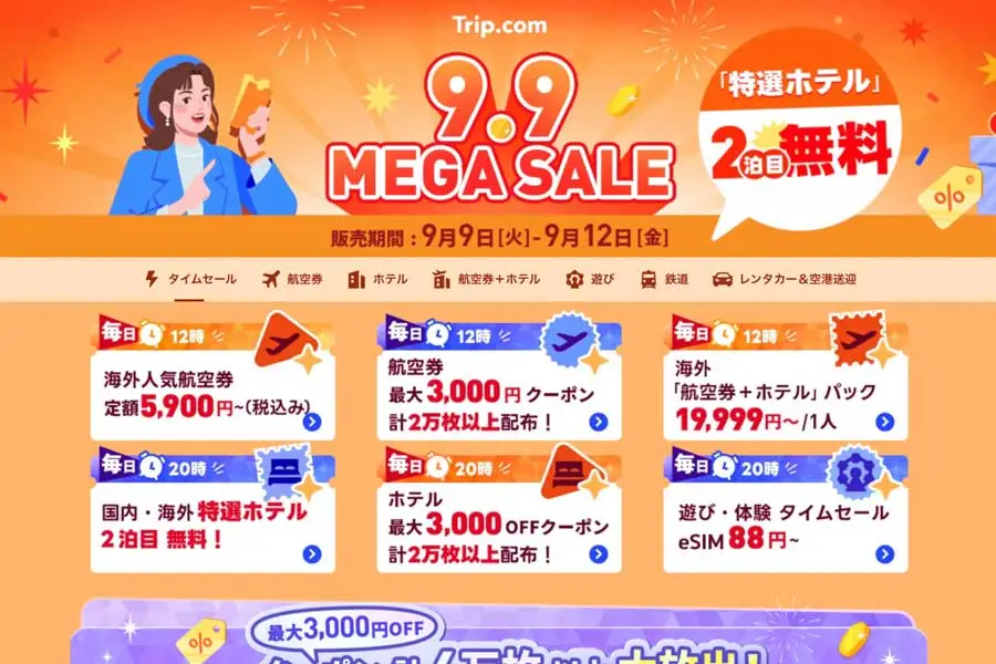 トリップドットコム將於9月9日至12日舉辦「9.9 MEGA SALE」。此次促銷活動將提供多條國際航線的優惠機票,包含前往首爾的票價由 5,900 日圓 / 約 HK$ 295 開始、前往台北的票價由 7,900 日圓 / 約 HK$ 395 起,以及前往曼谷的票價為 9,900 日圓 / 約 HK$ 495。每日至正午開始發售,數量有限。