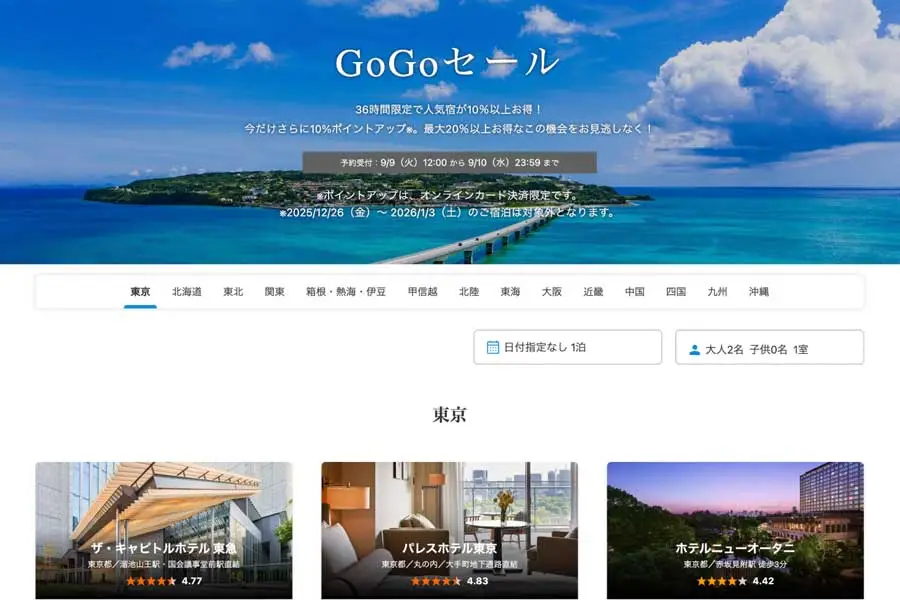 一休近日在其旅行預訂網站「一休.com」上舉辦「GoGo特賣」,促銷活動自9月9日中午12時開始,至10日結束。此次特賣活動限時36小時,顧客可享受多個人氣住宿場所的折扣,折扣幅度超過10%。需要注意的是,該促銷活動不適用於12月26日至2026年1月3日的年末年始期間。