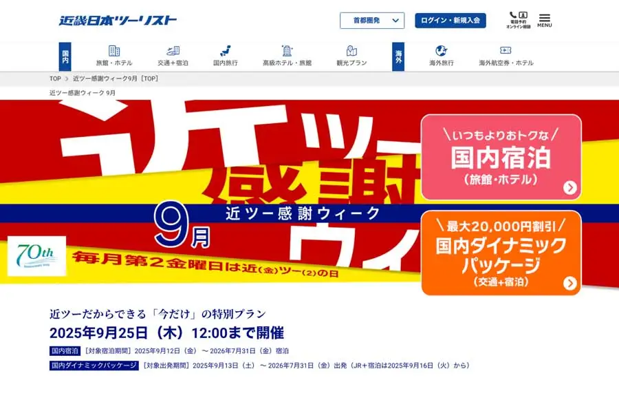近畿日本旅行近日舉行「近ツー感謝周」,活動日期由9月12日至25日中午12時。該活動每月第二個星期五定為「近ツー日」,旨在推廣國內住宿的特別計劃,同時提供國內動態套餐的優惠券,折扣最高可達2萬日圓。