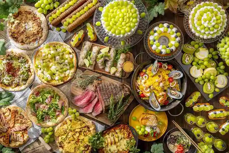 自助餐的菜單包括來自越南的生春卷、西班牙的海鮮飯、意大利的焗通心粉、韓國的參雞湯、秘魯的海鮮蔬菜酸橘汁醃魚等,並且還有受各國飲食文化啟發的原創披薩。甜品方面,則提供星形葡萄與洋梨的蛋糕、星形葡萄巧克力蛋糕、法式吐司及各式塔類甜品等。晚餐期間,食客可無限量享用當季星形葡萄,而午餐則可透過額外收費選擇無限量供應。