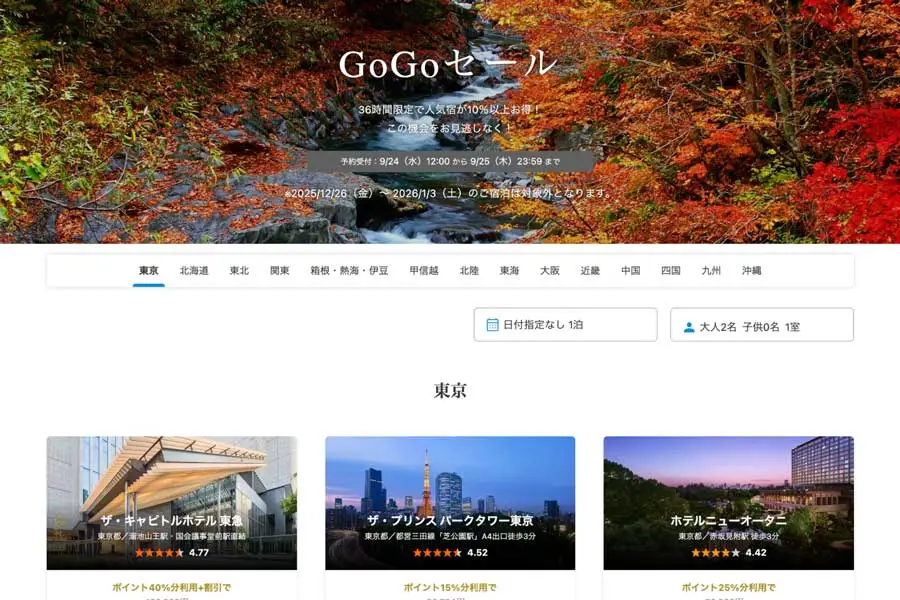 一休近日在旅行預訂網站「一休.com」推出為期36小時的「GoGo 銷售活動」,自9月24日中午12時至25日期間,參與的熱門住宿設施將提供10%以上的折扣。需要注意的是,年末年始期間,即12月26日至2026年1月3日,不在此優惠範圍內。