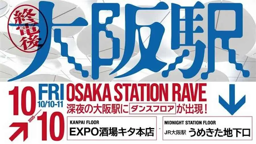 JR西日本及JR西日本SC開發與demo!expo合作,將於10月10日下午10時舉辦「OSAKA STATION RAVE」音樂活動。這是一次利用終電後車站空間舉行的一夜限量音樂盛事,名額僅為100名,活動將分為兩個部分,並包括音樂視頻直播及與SC開發相關的音樂項目拍攝。
