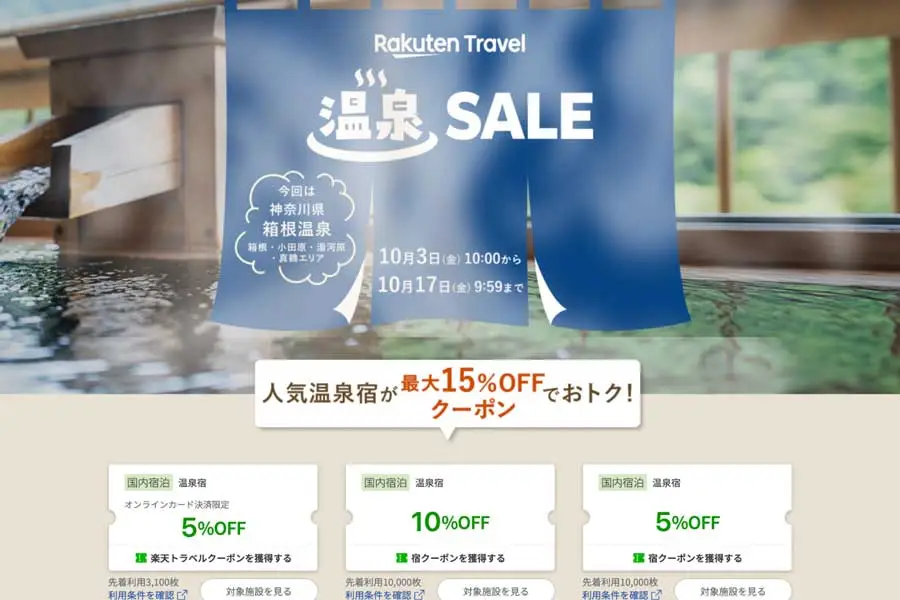 楽天集團將於10月3日上午10時至17日上午9時59分,在其旅行預訂網站「楽天旅遊」上舉辦「溫泉特賣會」。此次活動涵蓋的地區包括栃木縣的塩原溫泉及周邊的那須、板室和黑磯地區,顧客可享受最高15%的折扣優惠。