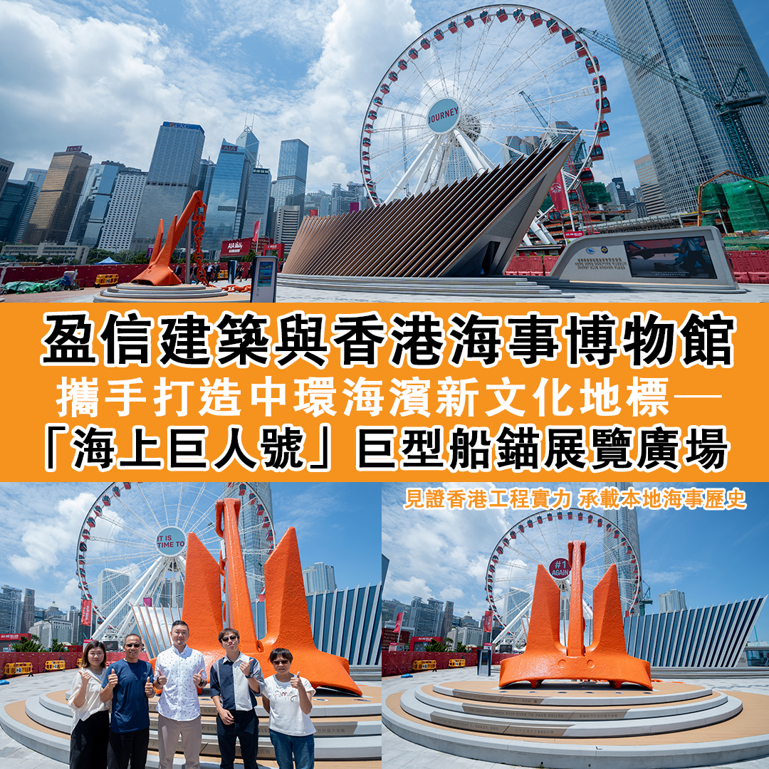 中環海濱新地標「海上巨人號」船錨展覽廣場近日正式落成,該展覽廣場由盈信建築負責承建,重達36噸的船錨成為主要展示物。此項目旨在展示香港的海事歷史,並為市民及遊客提供文化教育空間。