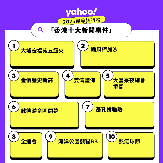 December 23, 2025 新聞稿 雅虎香港公佈2025年搜尋人氣榜 雅虎香港於2025年12月23日公佈了「Yahoo全年搜尋人氣榜」結果,涵蓋13個熱搜排行榜。這些排行榜總結了香港人關注的本地及全球事件。 排行榜中包括大埔宏福苑火災、颱風樺加沙及金價創歷史新高等重要新聞事件。這些事件反映了港人對社會及國際議題的關心。 在娛樂方面,大S徐熙媛、方大同及金賽綸等人物登上熱搜榜。十大熱搜餐廳及美食則包括千海水產及大寶冰室。 此外,IP經濟熱潮亦影響搜尋趨勢,Labubu及Jellycat成為熱門角色。這些搜尋數據顯示了網絡與現實生活的緊密連結。 睇完記得 Like & Share More 2026鴨脷洲洪聖傳統文化節將於3月展開 淺草ビューホテル春季草莓櫻花下午茶 多彩皇宮酒樓推出三重優惠活動 JR 東日本今日運費上漲 7.8%